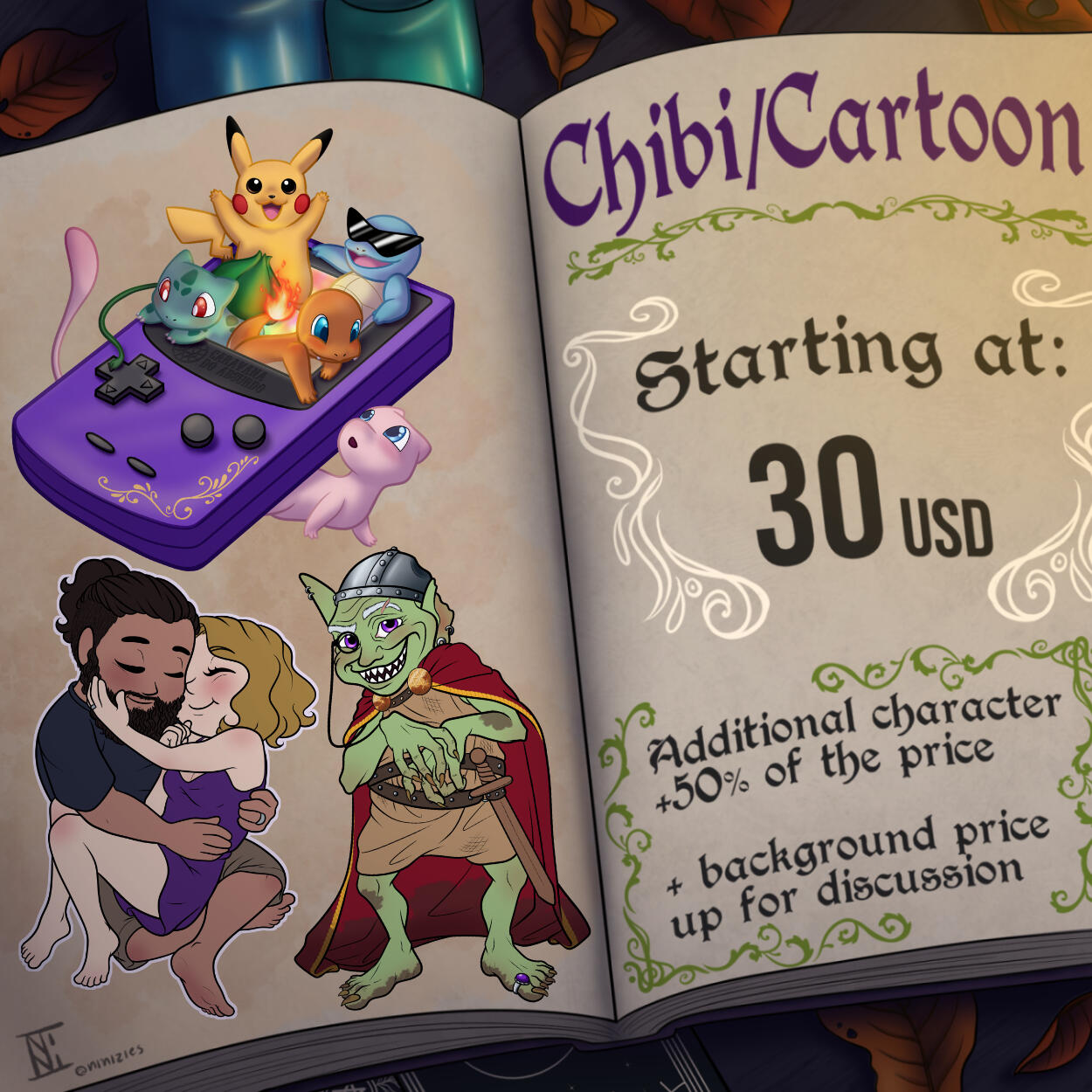 Cartoon/Chibi: a partir de R$ 80; +50 reais para um personagem adicional; arte de fundo o preço será discutido.Se estiver interessade ou tiver algumar dúvida entre em contato pelo meu instagram ou Blusky.