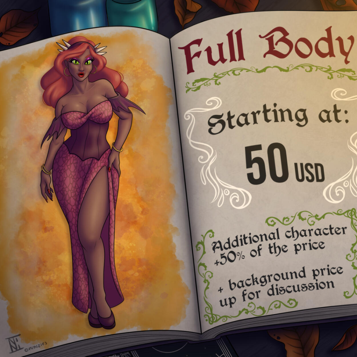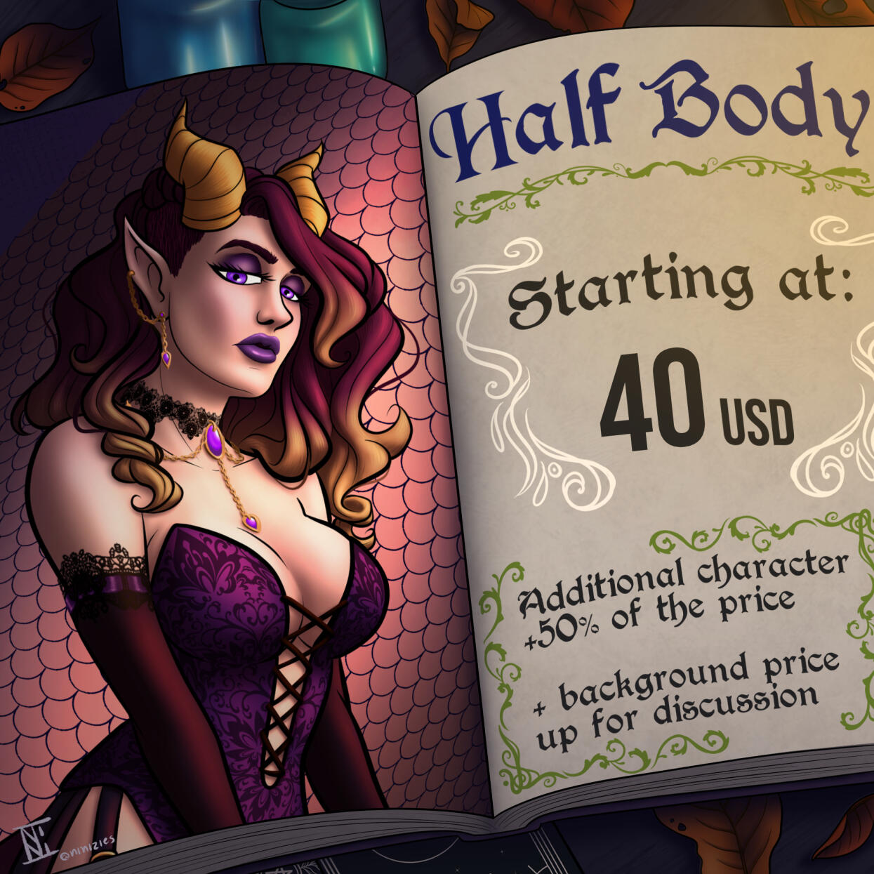 Busto/Meio Corpo: a partir de R$ 100; +70 reais para um personagem adicional; arte de fundo o preço será discutido.